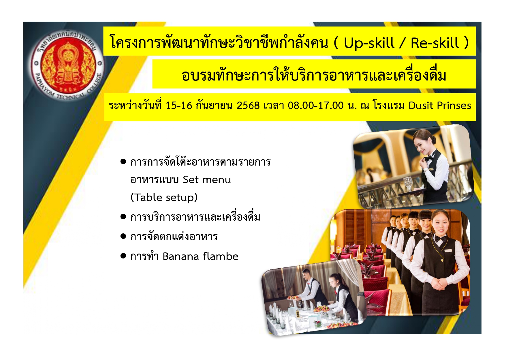 ประกาศ ชมรมวิชาชีพการโรงแรม โครงการพัฒนาทักษะวิชาชีพกำลังคน ( Up-skill / Re-skill ) อบรมทักษะการให้บริการอาหารและเครื่องดื่ม