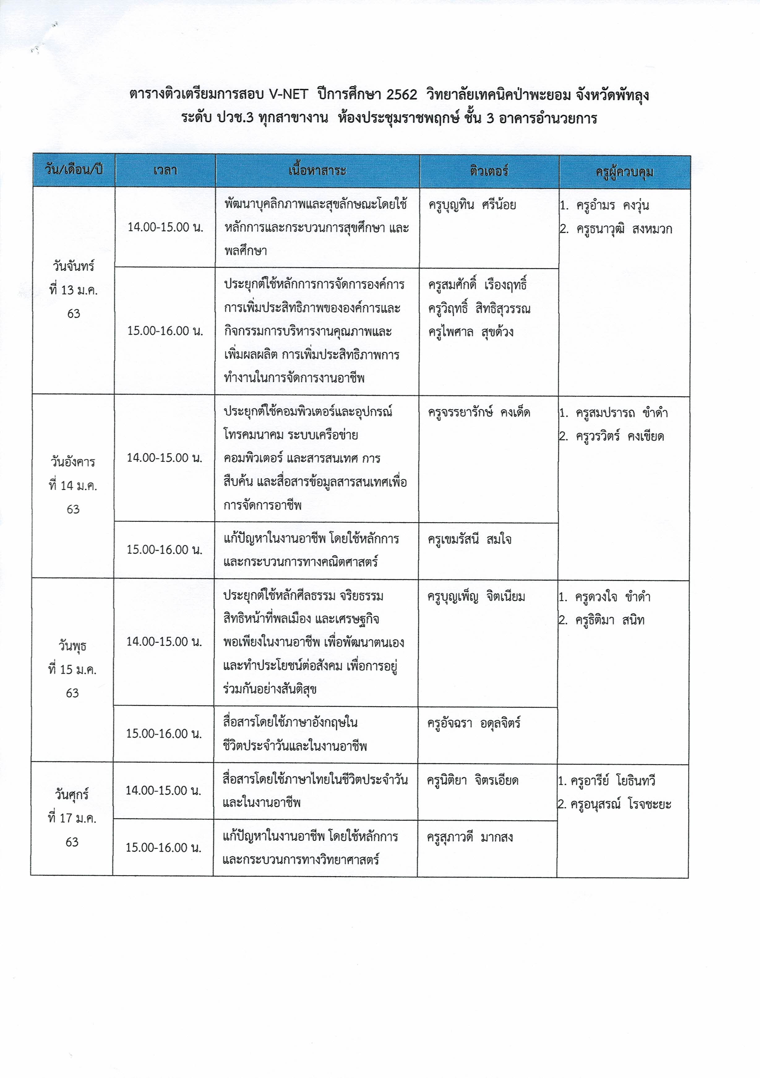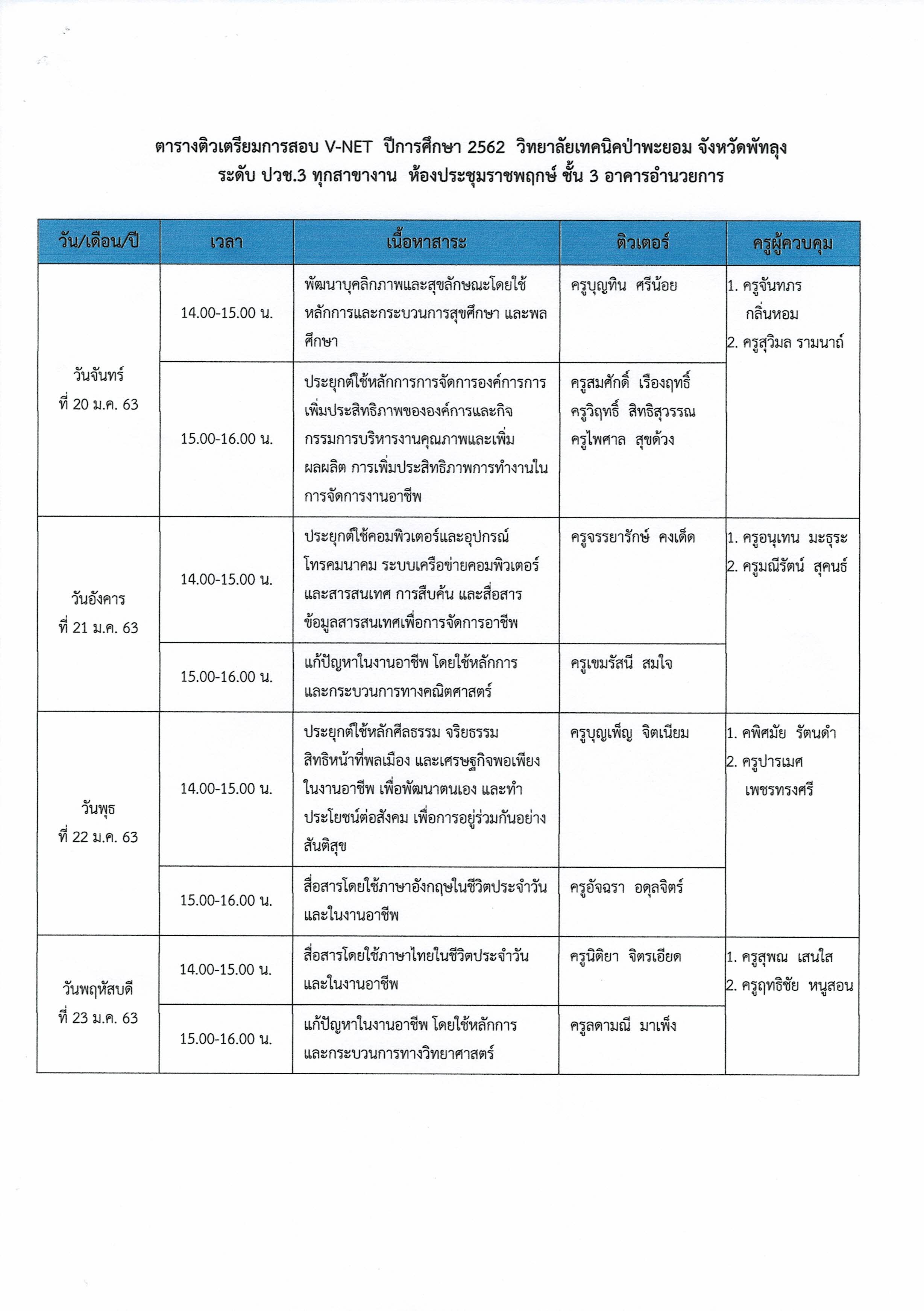 ตารางติวเตรียมการสอบ V-NET ปีการศึกษา 2562 ระดับชั้น ปวช.3