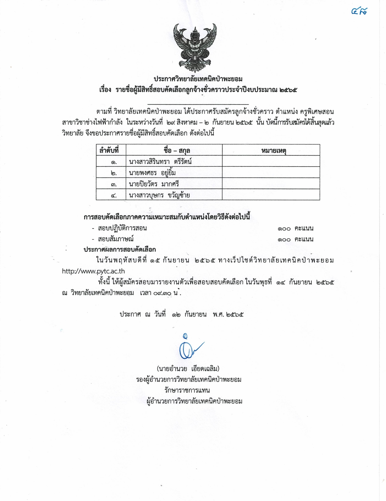 ประกาศ รายชื่อผู้มีสิทธิ์สอบคัดเลือกลูกจ้างชั่วคราวตำแหน่งครูพิเศษสอน(ช่างไฟฟ้า)ประจำปีงบประมาณ 2565