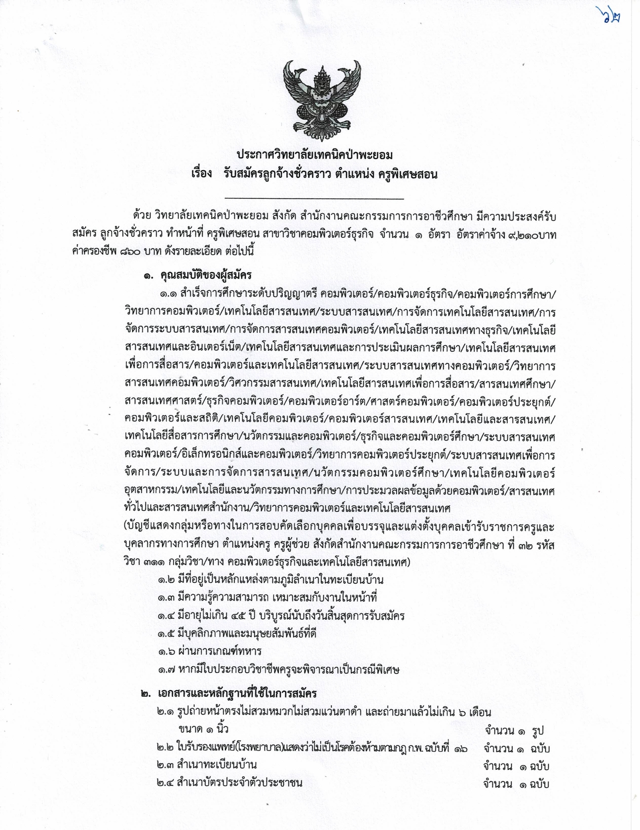 ประกาศ รับสมัครลูกจ้างชั่วคราว ตำแหน่งครูพิเศษสอน (คอมพิวเตอร์ธุรกิจ)