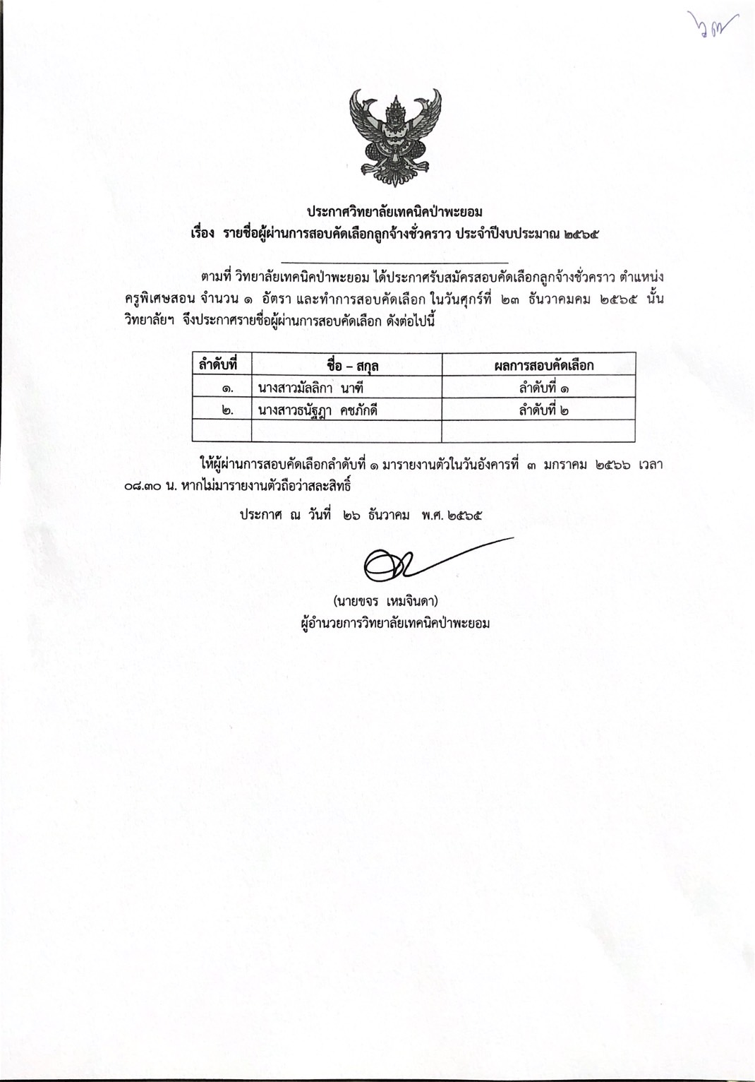 ประกาศ รายชื่อผู้ผ่านการสอบคัดเลือกลูกจ้างชั่วคราวตำแหน่งครูพิเศษสอน(คอมพิวเตอร์ธุรกิจ)ประจำปีงบประมาณ 2565