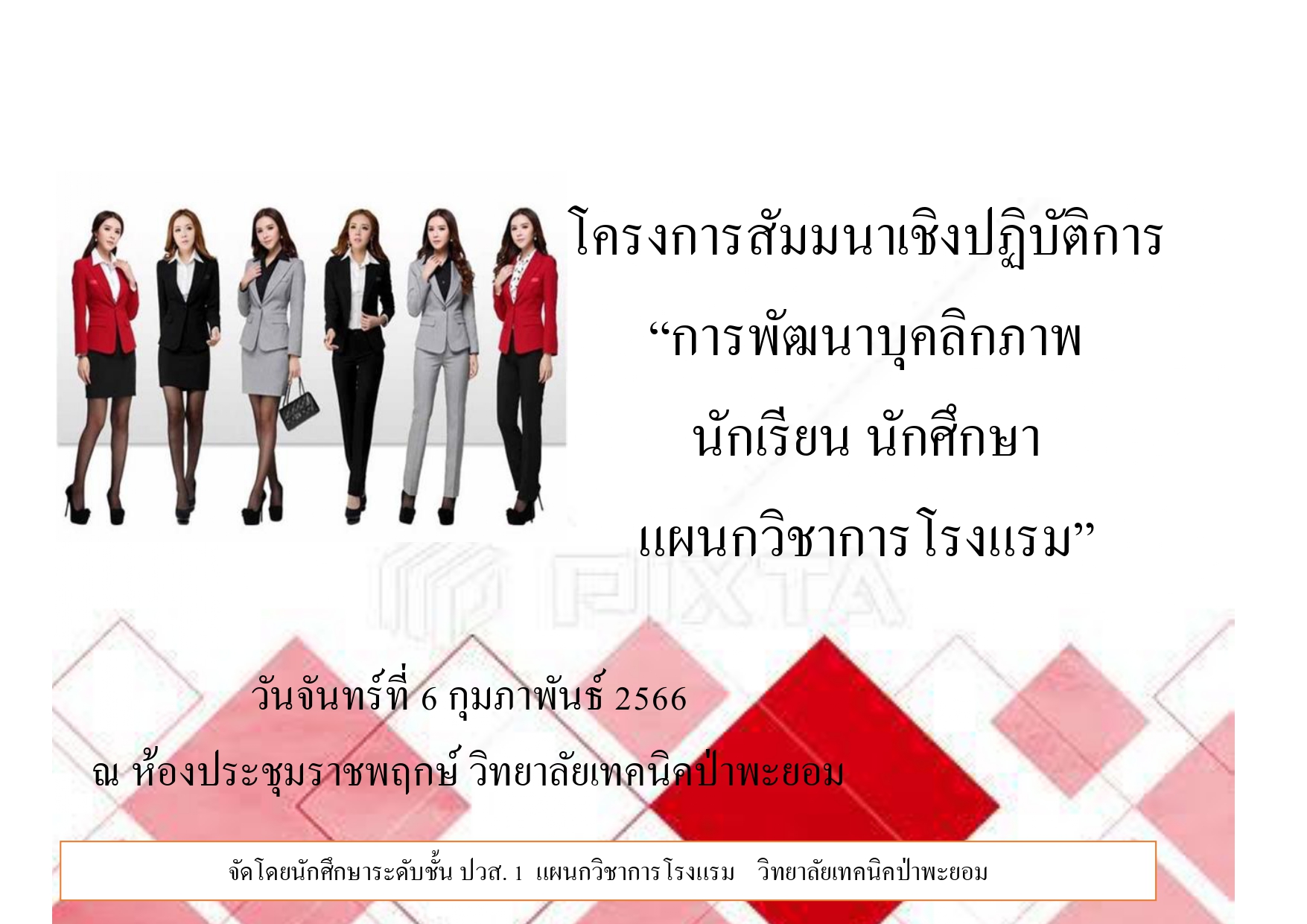 ประกาศ ชมรมวิชาชีพการโรงแรม จัดโครงการสัมมนาเชิงปฏิบัติการ “การพัฒนาบุคลิกภาพ นักเรียน นักศึกษา แผนกวิชาการโรงแรม”