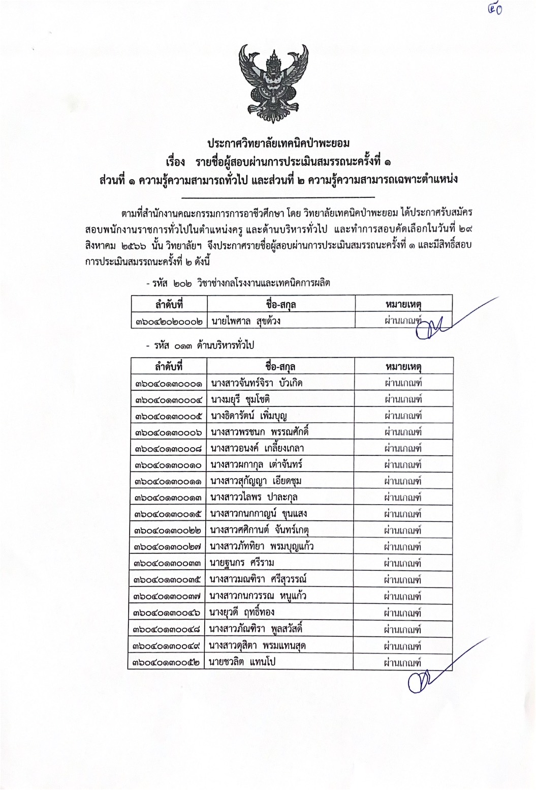 ประกาศ รายชื่อผู้สอบผ่านการประเมินสมรรถนะครั้งที่ 1 ส่วนที่ 1 ความรู้ความสามารถทั่วไป และส่วนที่ 2 ความรู้ความสามารถเฉพาะตำแหน่ง